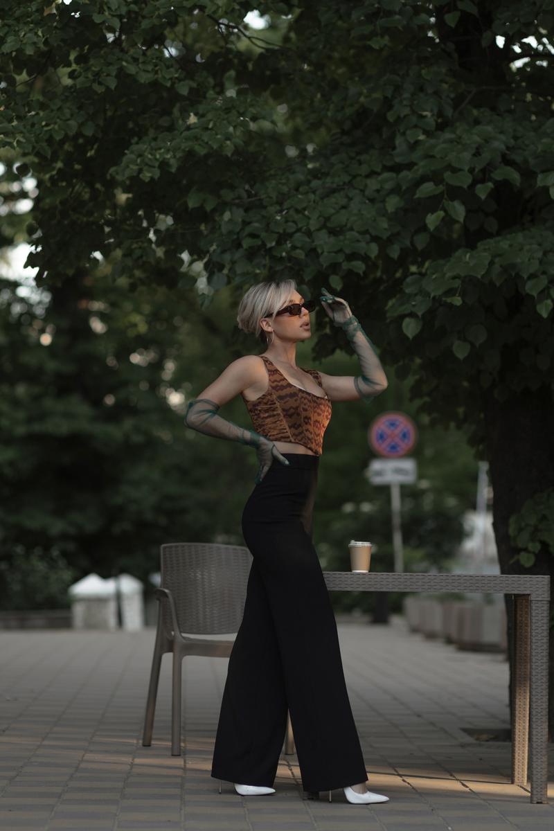 Repoussez les frontières de la mode en mêlant le sauvage et le chic avec brio. Tout cela grâce à un corset bustier à bretelles arborant un motif zébré évoquant un esprit farouchement indépendant. En bas, un pantalon noir taille haute à pattes d'éléphants ajoutera une touche rétro chic à votre allure. Il ne vous manquera plus qu'une paire de chaussures à talons blanches, des lunettes de soleil noires et de jolies boucles d'oreilles pour compléter votre look.