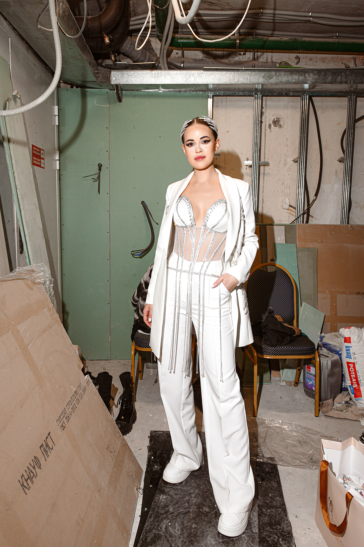 Resplendissez dans un look entièrement blanc en portant un corset à strass transparent qui met en valeur votre silhouette. Associé à un blazer immaculé et un pantalon ample, le corset crée un équilibre entre sophistication et décontraction. De grosses bottines en cuir blanc ajoutent une touche rebelle à l'ensemble.