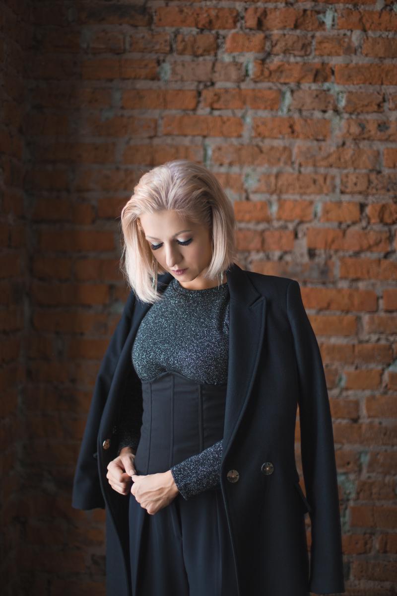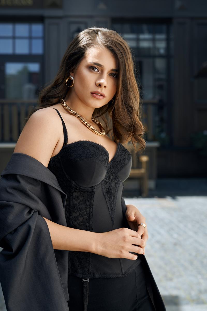 Incarnez glamour et sophistication grâce à une tenue d'une saisissante élégance. Pour cela, optez pour un corset bustier noir à fines bretelles et porte-jarretelles révélant une sensualité et une confiance assumées. Associez-le à un blazer impeccable, porté normalement ou sur les épaules ainsi qu'un pantalon ajusté. Complétez votre tenue avec des détails luxueux tels qu'une paire de boucles d'oreilles en or pour encadrer votre visage et/ou un imposant collier doré.