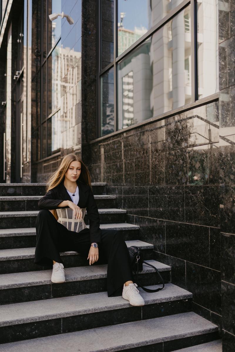 Optez pour un mélange audacieux de sophistication et de non-conformisme grâce à une tenue qui transcende les attentes. Pour cela, un corset serre-taille ivoire transparent associé à une paire de baskets assorties fusionne l'élégance et le confort. Un blazer noir classique apporte une note de formalité et de structure à l'ensemble tandis qu'un pantalon noir ajusté soulignera vos jambes élancées.