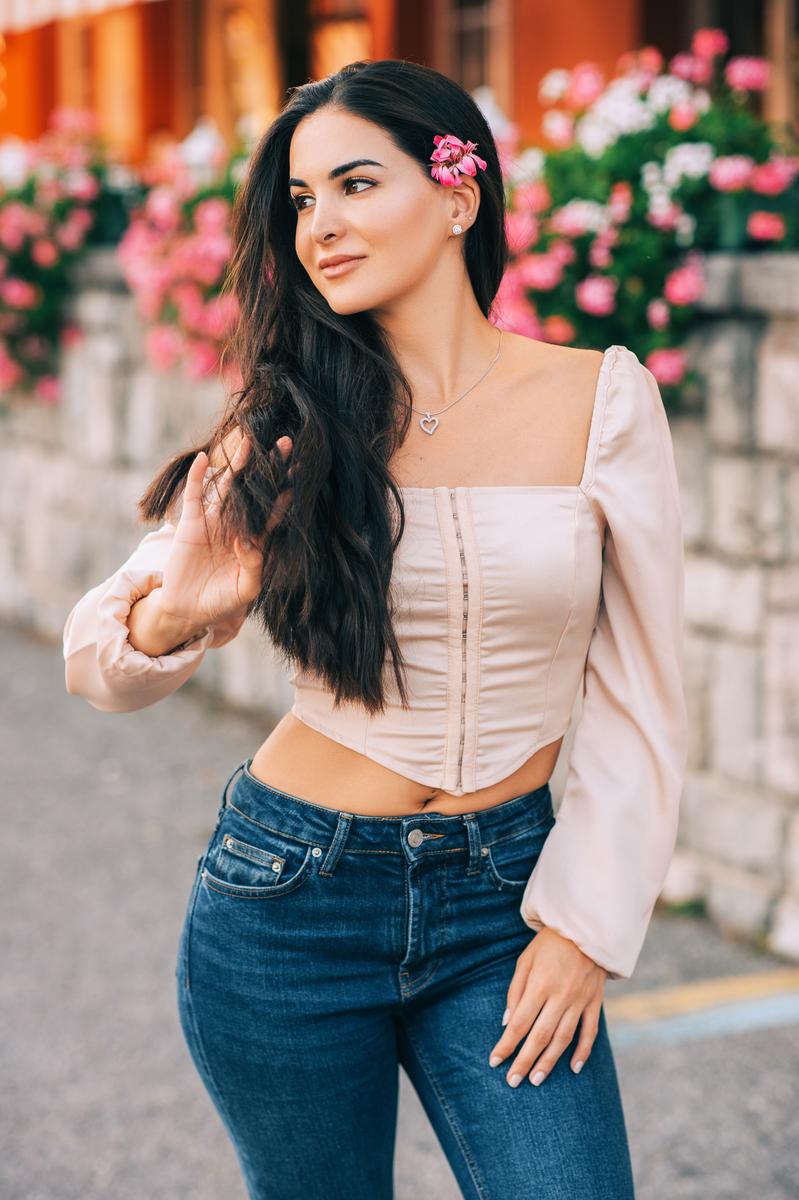 Incarnez douceur et romantisme avec une combinaison mêlant la légèreté du rose pâle avec la robustesse du jean. Pour ce faire, enfilez un crop top corset épousant vos courbes avec un denim tout ce qu'il y a de plus classique. Ajoutez une fleur rose derrière votre oreille ainsi qu'un collier à détail cœur autour de votre cou pour mettre en valeur votre charme naturel.