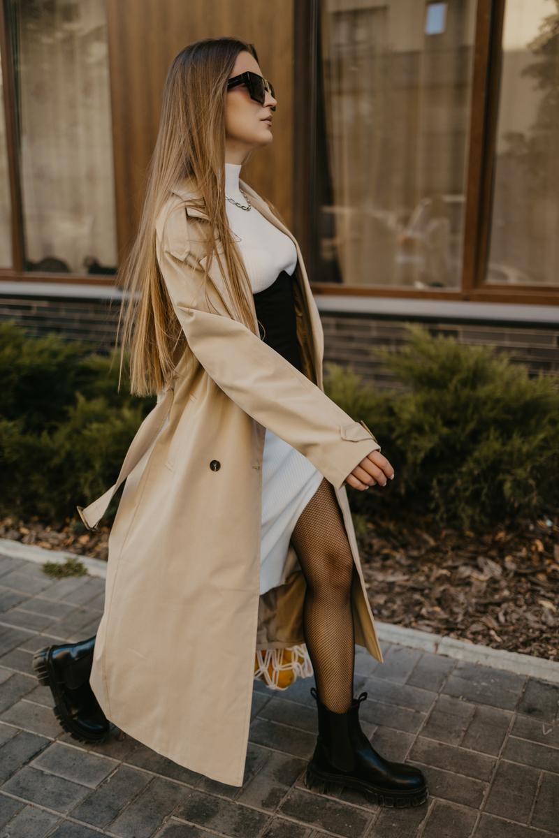 Alliez grâce et audace avec une robe blanche ras du cou sur laquelle vous enfilerez un serre-taille corset noir pour apporter une touche de féminité et valoriser votre silhouette. Par-dessus, optez pour un long imperméable beige qui flottera autour de vous avec une élégance poétique. Complétez votre tenue avec une paire de boots pour une dose d'assurance rebelle ainsi qu'une chaîne en argent.