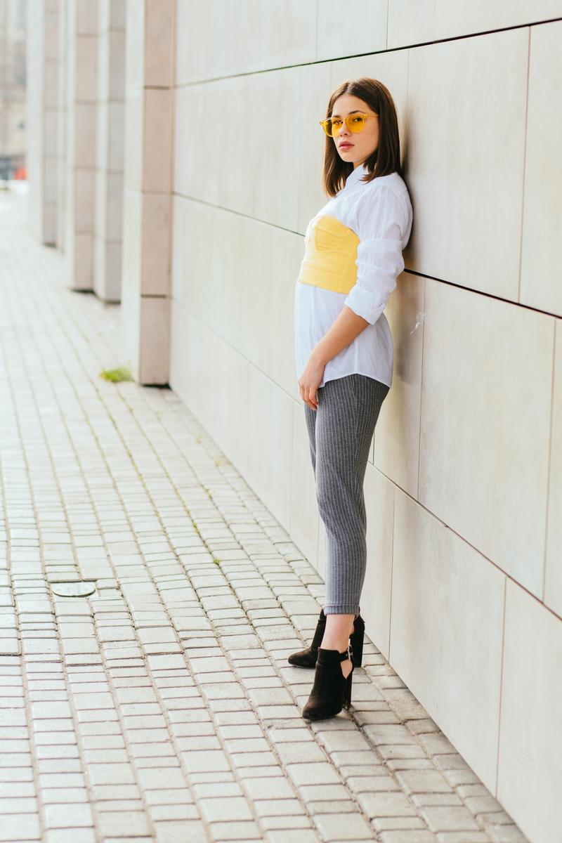 Soyez un véritable rayon de soleil en enfilant un corset jaune court par-dessus une chemise blanche classique. De quoi créer un équilibre entre la fraîcheur et l'élégance. Des chaussures à talons compléteraient parfaitement votre look ainsi qu'une paire de lunettes de soleil assorties au corset pour une note glamour.