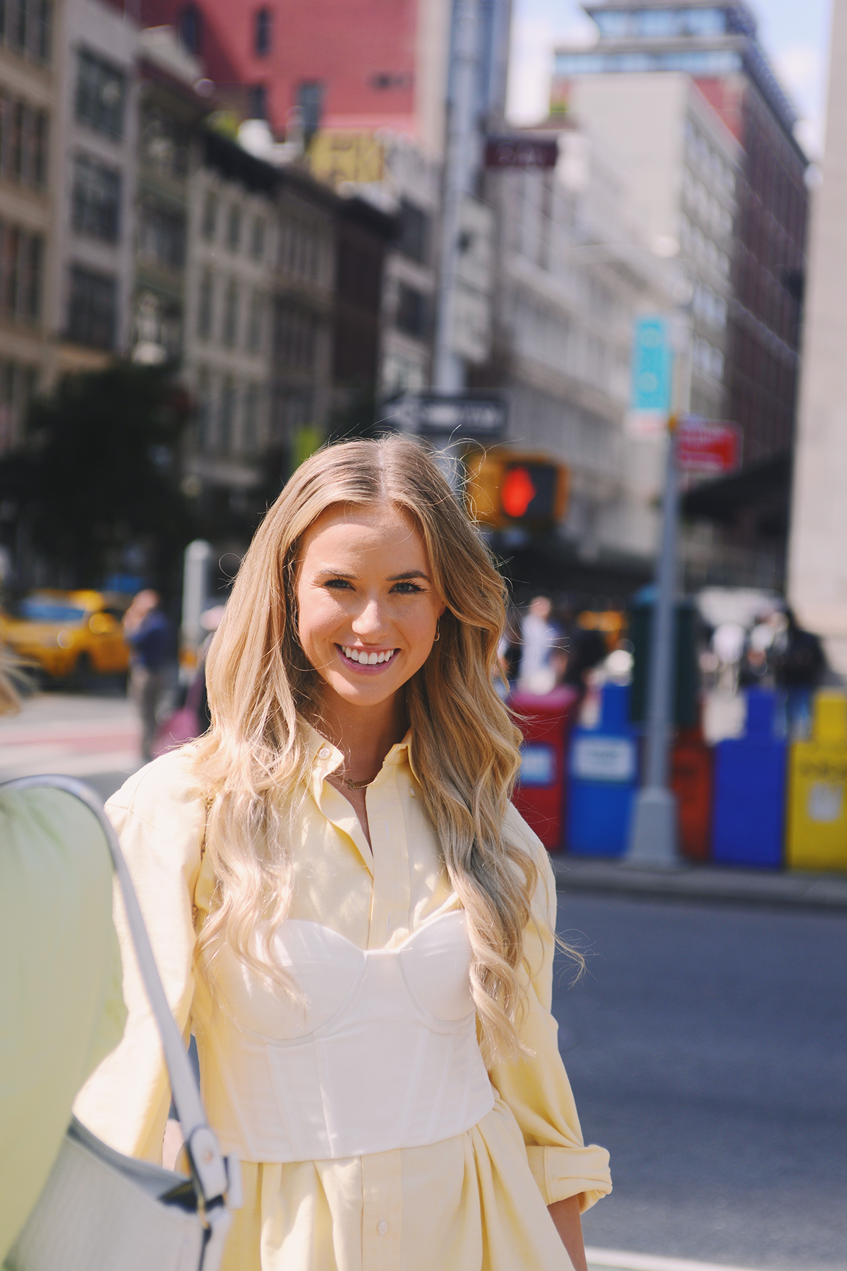 Par-dessus une robe chemise jaune virevoltant gracieusement, un top corset blanc court audacieux crée une silhouette sculpturale. Cette fusion de pièces est empreinte d'une esthétique qui combine habilement l'élégance classique avec une dose de non-conformisme artistique.